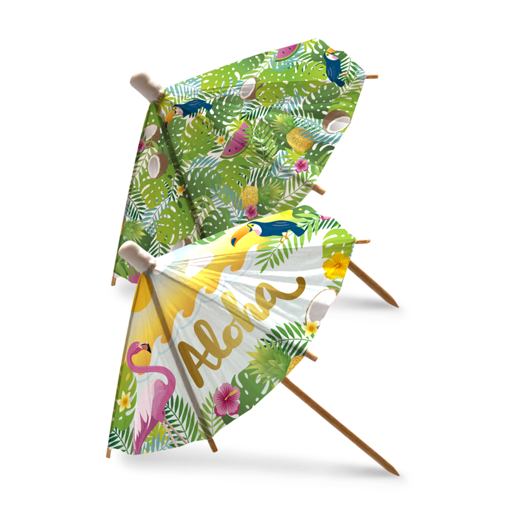 Luo näyttävä trooppinen tunnelma juhliin ja tarjoiluihin näillä suurikokoisilla Aloha-teemaisilla paperivarjoilla! 18 cm cocktailvarjot ovat täydellinen valinta, kun haluat tuoda esille juomat ja annokset entistä näyttävämmin.