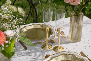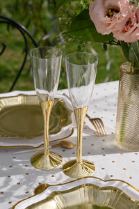 Nosta juhlatunnelma uudelle tasolle näillä elegantilla uudelleenkäytettävillä kuohuviinilaseilla. Tyylikäs muotoilu ja metallinhohtoinen jalka tuovat kattaukseen ripauksen luksusta – täydellinen valinta, kun haluat juhlia tyylillä ilman kompromisseja käytännöllisyydessä.