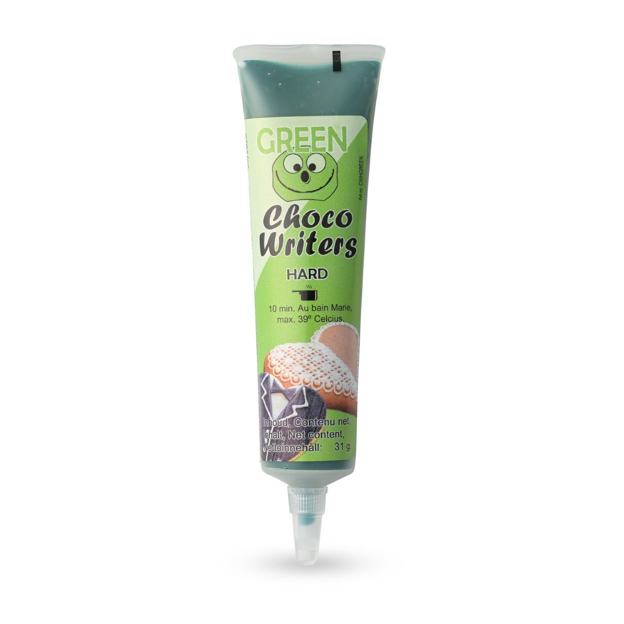 Tee herkullisen näyttäviä koristeita ja kirjoituksia tällä kätevällä vihreällä Choco Writer -suklaakoristeaineella! Sulata tuubi lämpimässä vedessä (enintään 39°C) noin 10 minuutin ajan ja pursota sitten suoraan kakkujen, muffinien, keksien tai muiden leivonnaisten pinnalle.
