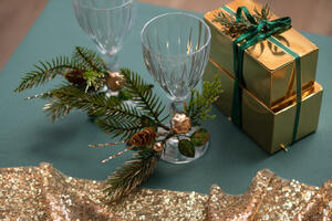 Tässä keinotekoisessa oksassa on havuja, käpy sekä kullanvärisiä koristeita.