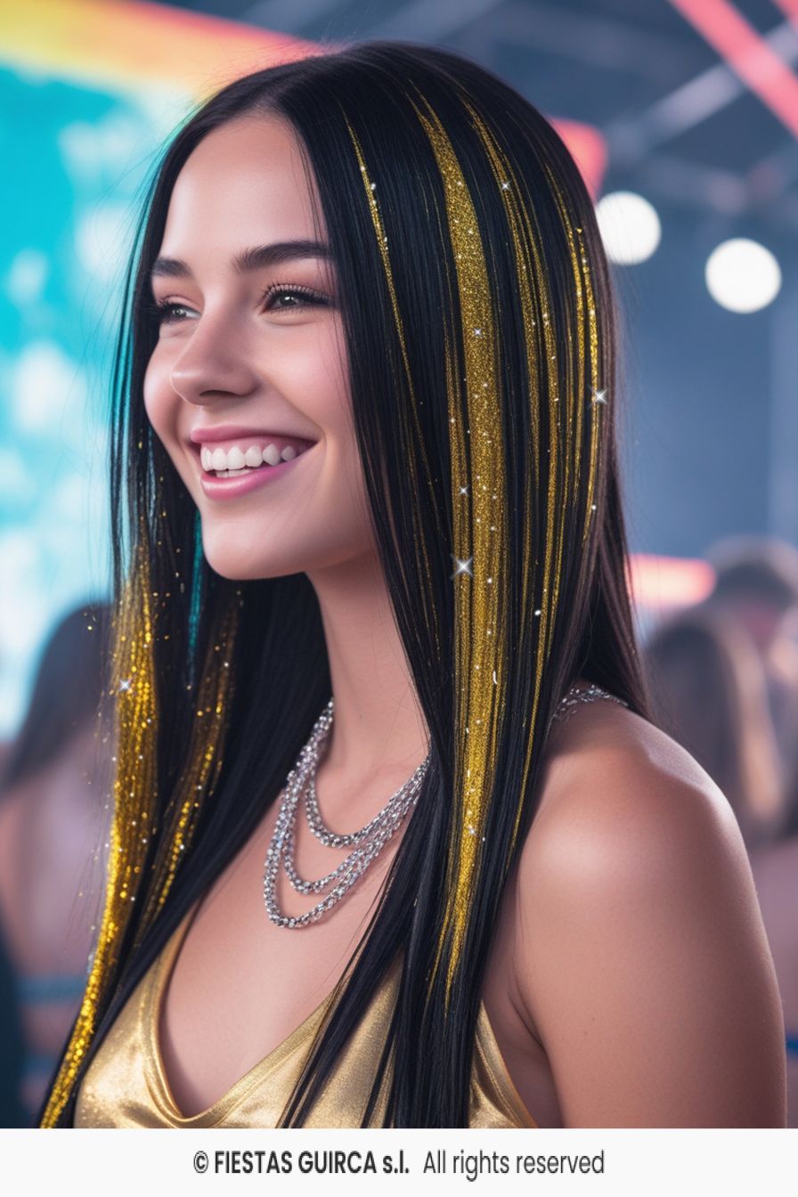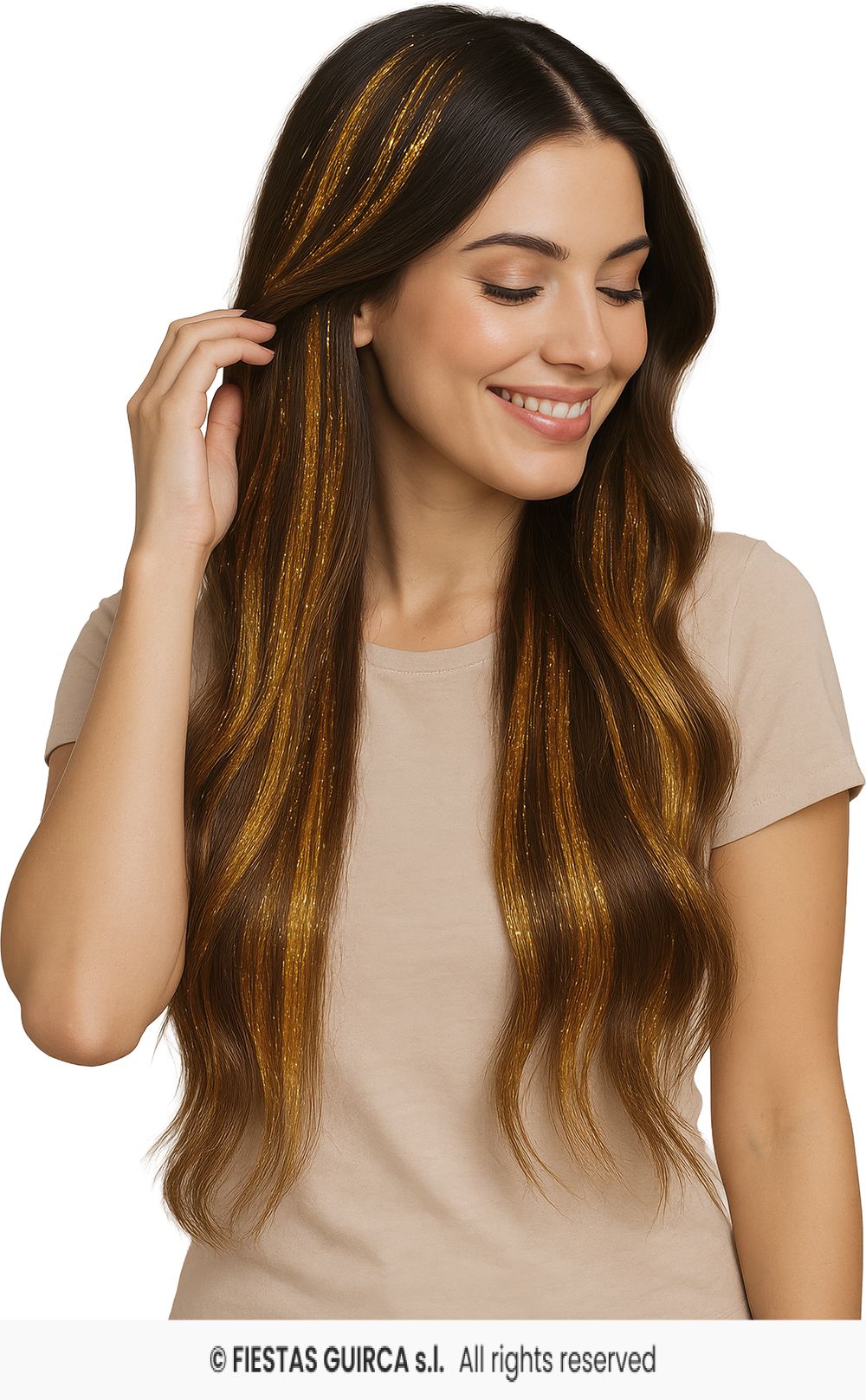 Koristele hiuksesi näillä kullanvärisillä hiuslisäkkeillä. Pakkauksessa on 3 kpl lisäkkeitä, joiden pituus on 50 cm.