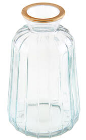 Tuo kattaukseen modernia ilmettä ja ripaus luksusta tällä trendikkäällä kartion muotoisella lasimaljakolla. Sen pelkistetty mutta näyttävä muoto yhdistettynä kauniiseen kirkkaaseen lasiin tekee siitä täydellisen katseenvangitsijan niin juhlapöydässä kuin sisustuksessa. Maljakon suuta kiertää kullanvärinen reunus.