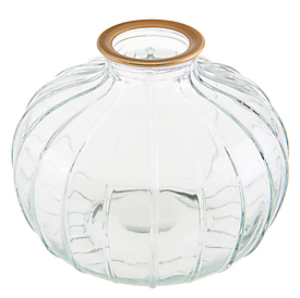 Tuo kattaukseen modernia ilmettä ja ripaus luksusta tällä trendikkäällä pallon muotoisella lasimaljakolla. Sen pelkistetty mutta näyttävä muoto yhdistettynä kauniiseen kirkkaaseen lasiin tekee siitä täydellisen katseenvangitsijan niin juhlapöydässä kuin sisustuksessa. Maljakon suuta kiertää kullanvärinen reunus.