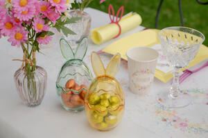 Ihastuttava lasinen munanmuotoinen säilytyspurkki, jossa pupun korvat.