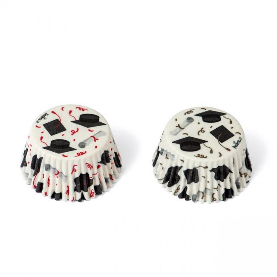 Pakkauksessa 36 kpl valkopohjaisia muffinivuokia, joissa koristeena valmistujaislakki.