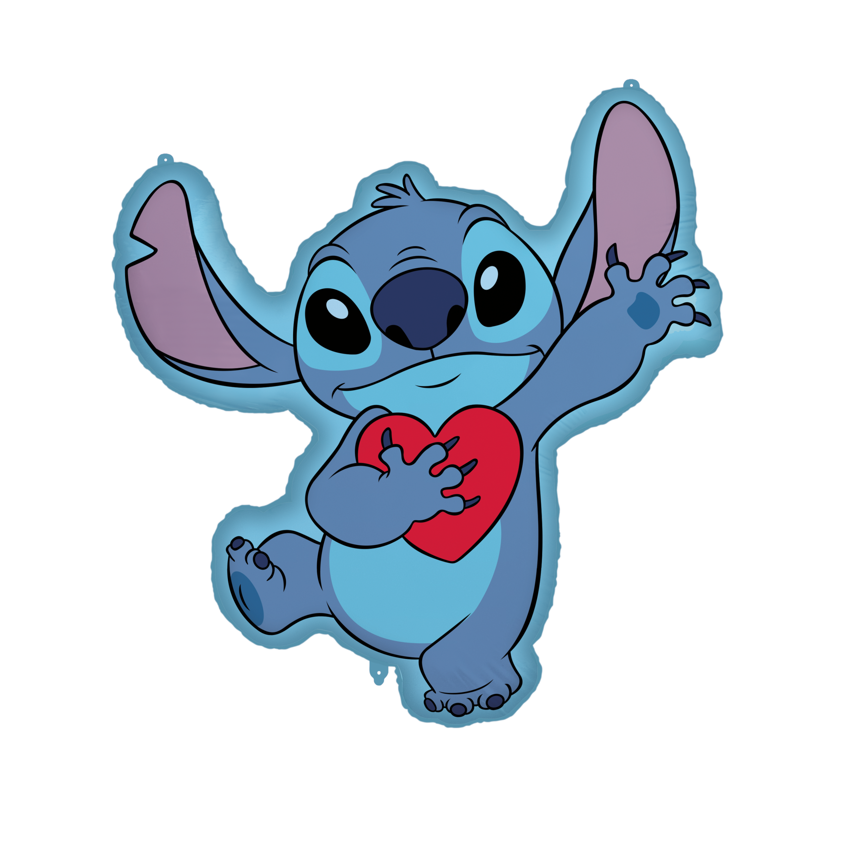 Suloinen Stitch muotofoliopallo vaikka Lilo & Stitch aiheisiin juhliin. Stitch pitelee kädessään punaista sydäntä. Foliopallon koko täyttämättömänä on 75 x 86 cm.