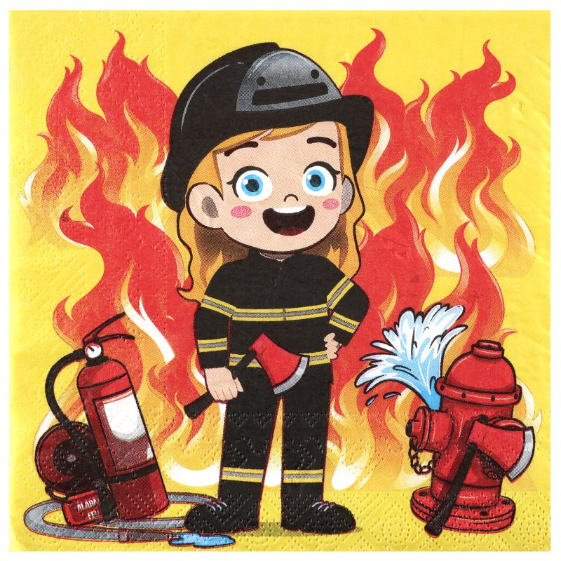 Servietissä seikkailee rohkea pieni palomies, joka on valmis sammuttamaan liekit – varustettuna letkulla, sammutinpullolla ja kirveellä. Lisää nämä lautasliinat juhlapöytään ja luo hauska, teemaan sopiva tunnelma, josta kaikki nauttivat!