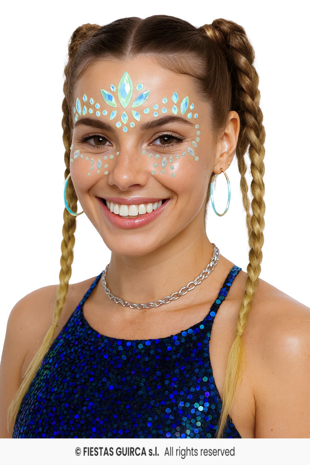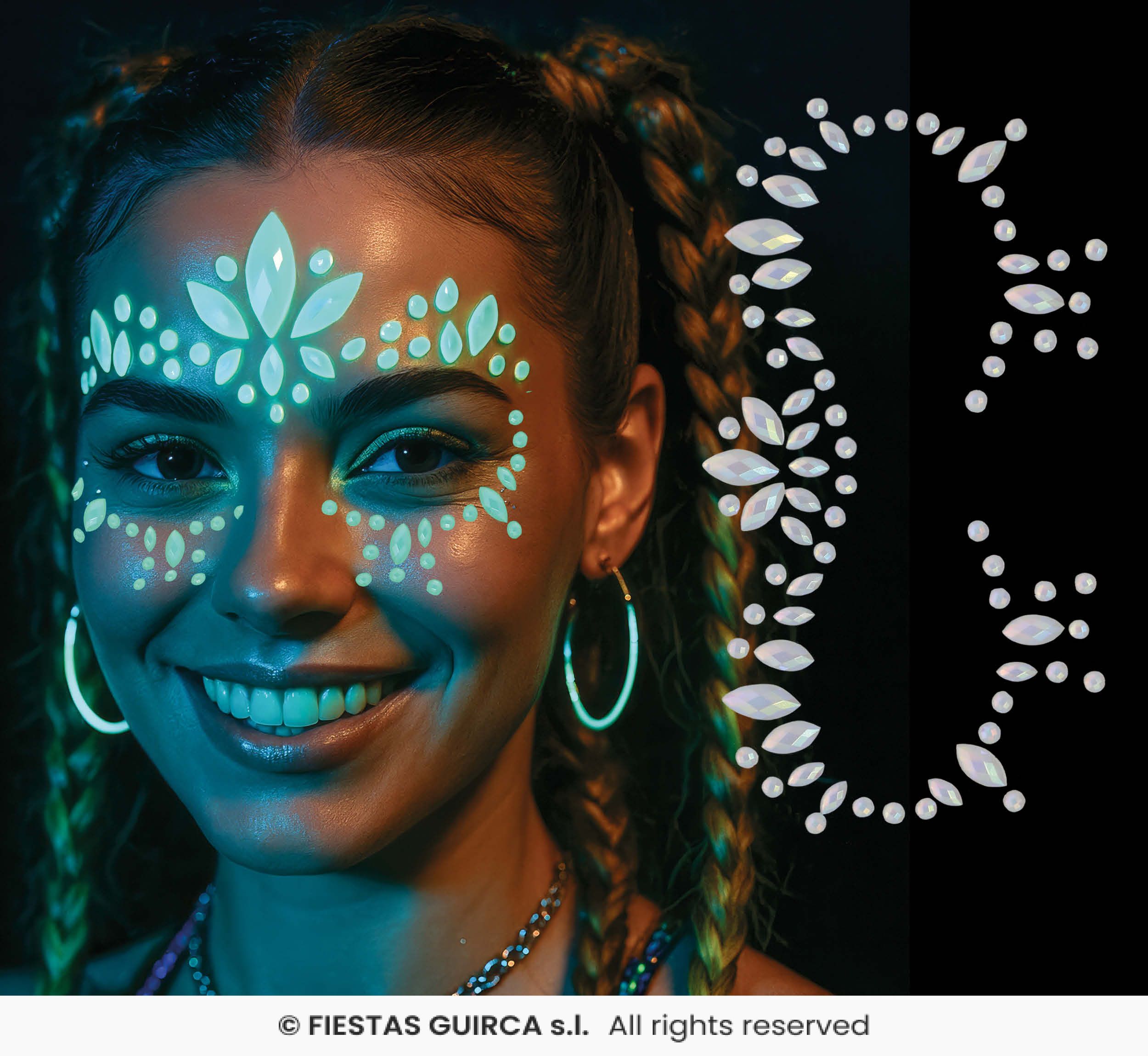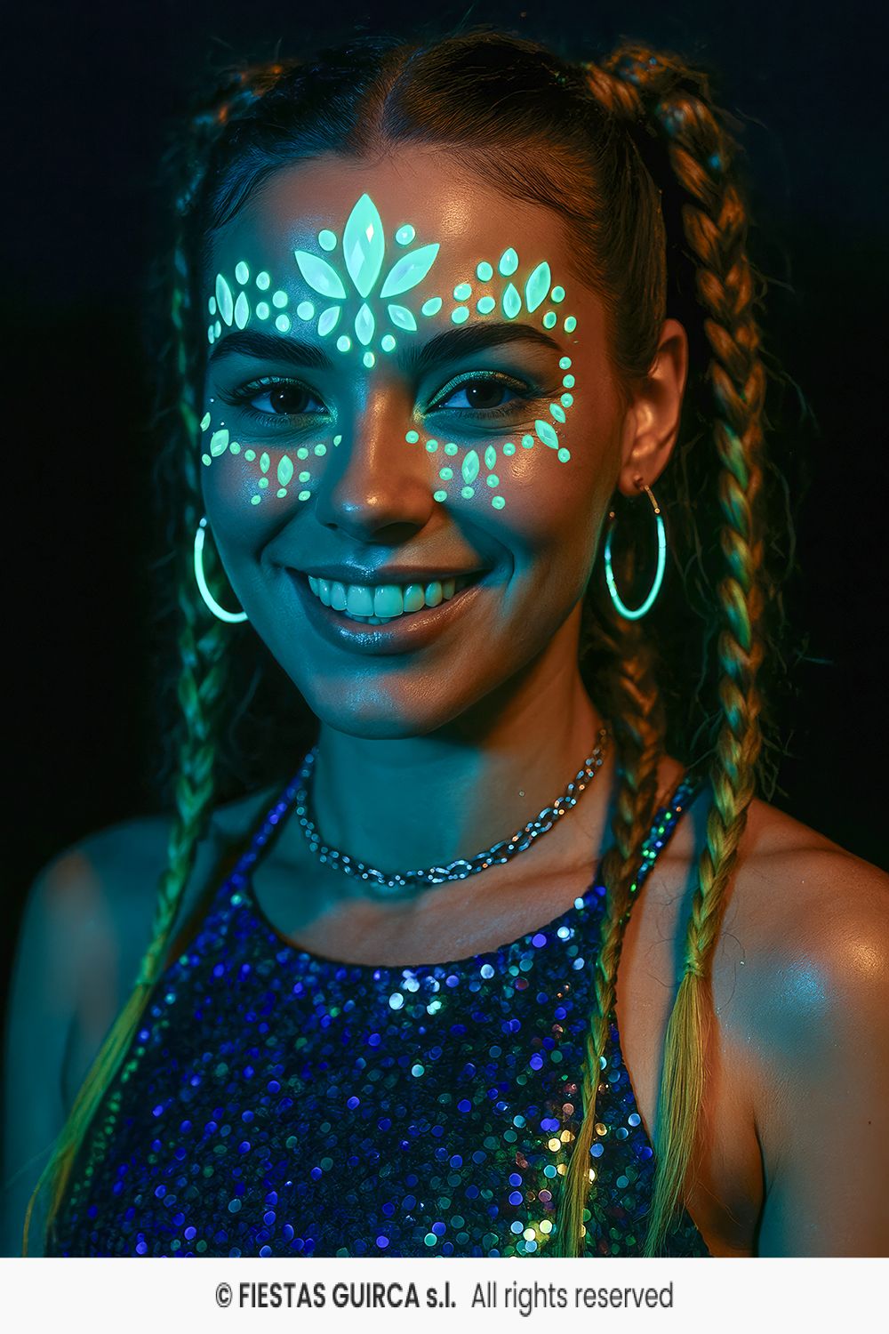 Koristele kasvosi näillä pimeässä hohtavilla timanteilla. Saat niin juhliin kuin festareille näyttävät kasvot! Voit käyttää timantteja yksinään tai sommitella niistä kuvan mukaisen kuvion.
