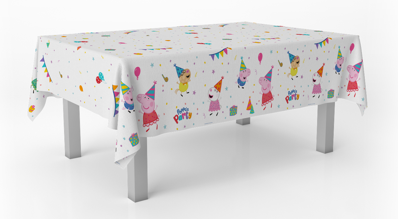 Pipsa Possu aiheisiin juhliin muovinen pöytäliina, jossa Pipsa Possu ystävineen juhlii. Pöytäliinan koko on 120 x 180 cm.