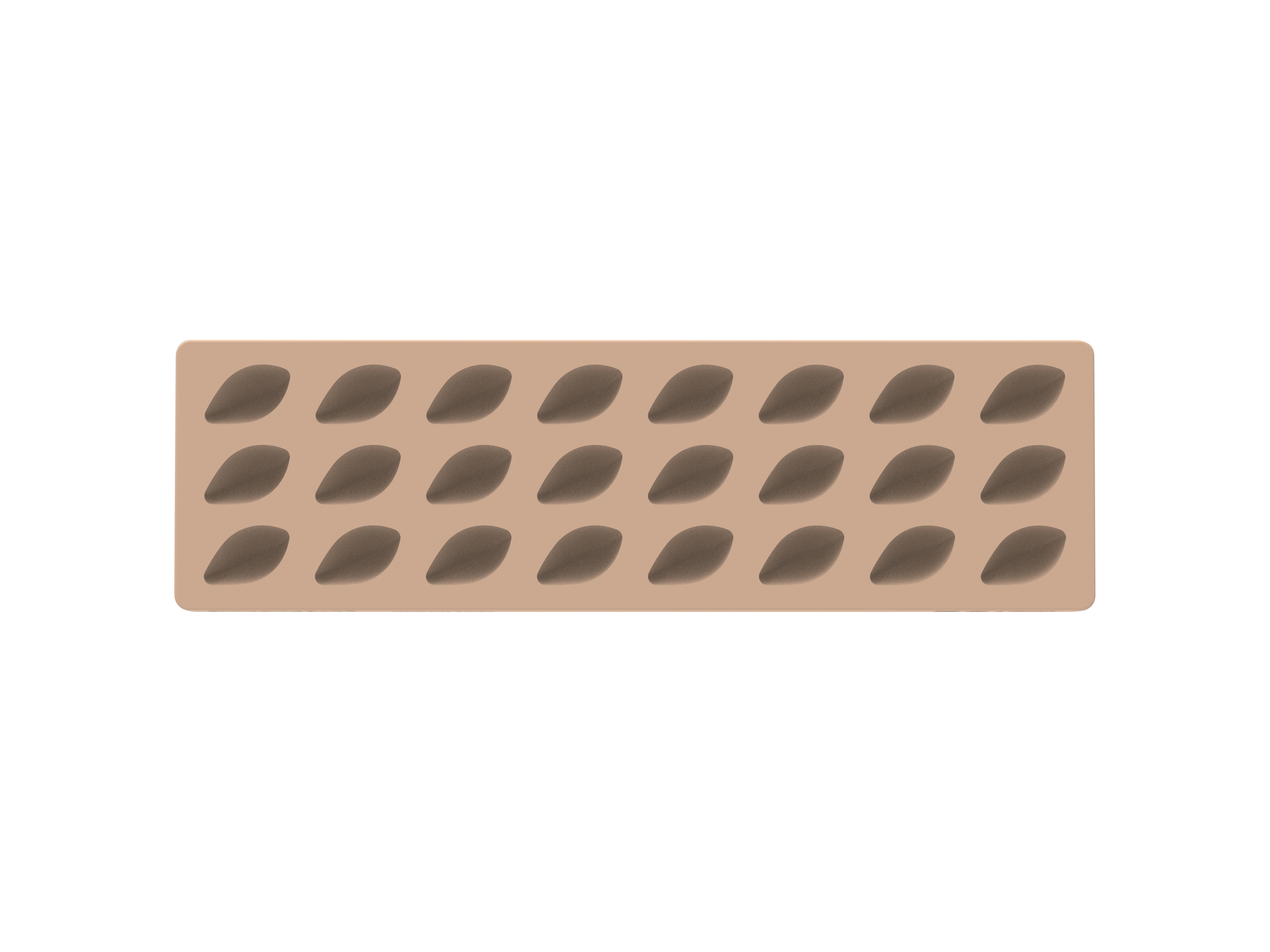 Muotilla saa tehtyä 42 mm x 27 x 17 mm kokoisia makeisia yhteensä 24 kpl. Muotin koko 275 x 175 x 25 mm. Silikonimuotin koko 295 x 83 x 12 mm.