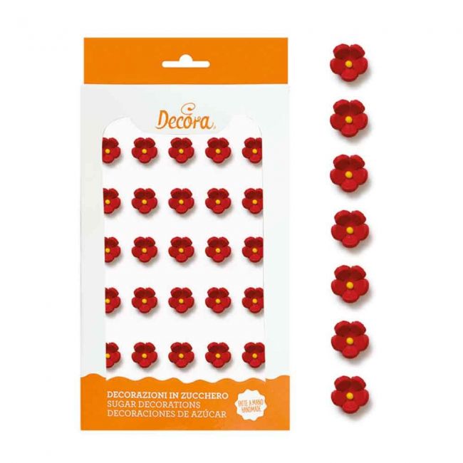 Pakkauksessa 30 kpl pieniä, halkaisijaltaan n. 1 cm kokoisia syötäviä punaisia sokerikukkia.