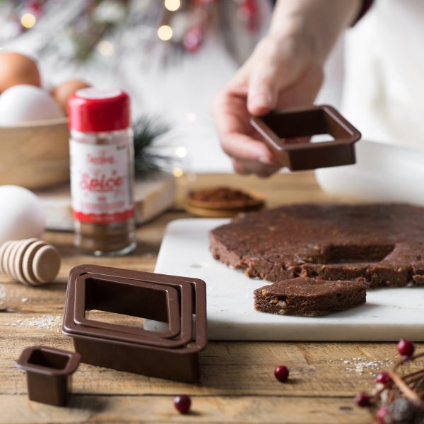 Viiden timantinmuotoisen muovisen piparkakkumuotin setti; täydellinen klassisen jouluisen mostacciolo-leivonnaisen, perinteisen italialaisen jälkiruoan, valmistukseen. Sopii myös kekseille, makeisille ja paljon muulle.