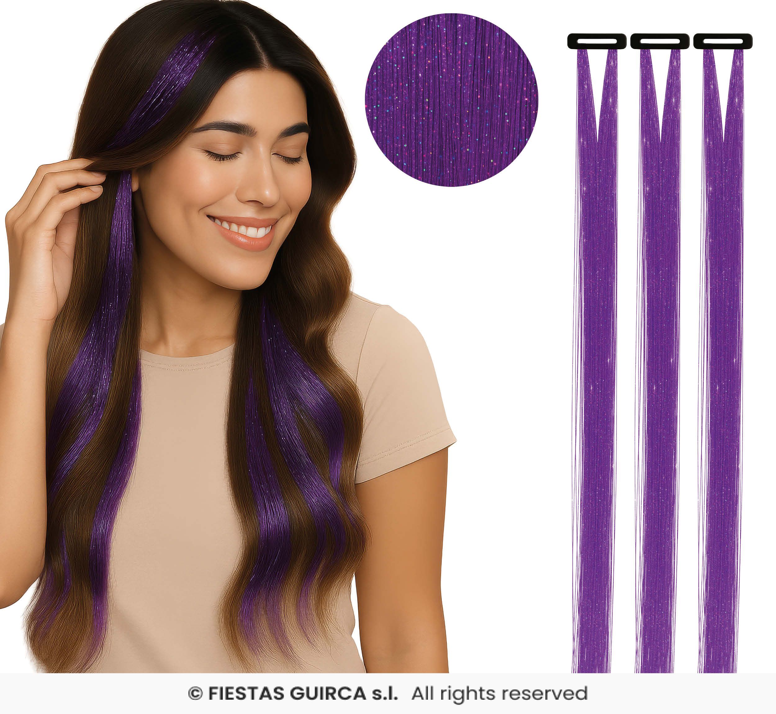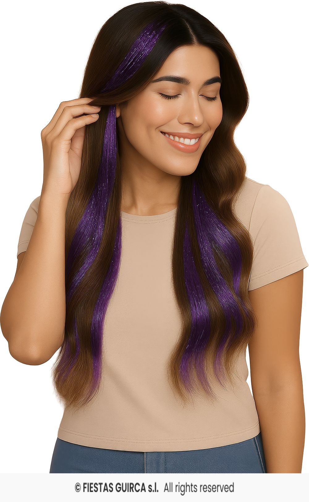 Koristele hiuksesi näillä violetinvärisillä hiuslisäkkeillä. Pakkauksessa on 3 kpl lisäkkeitä, joiden pituus on 50 cm.
